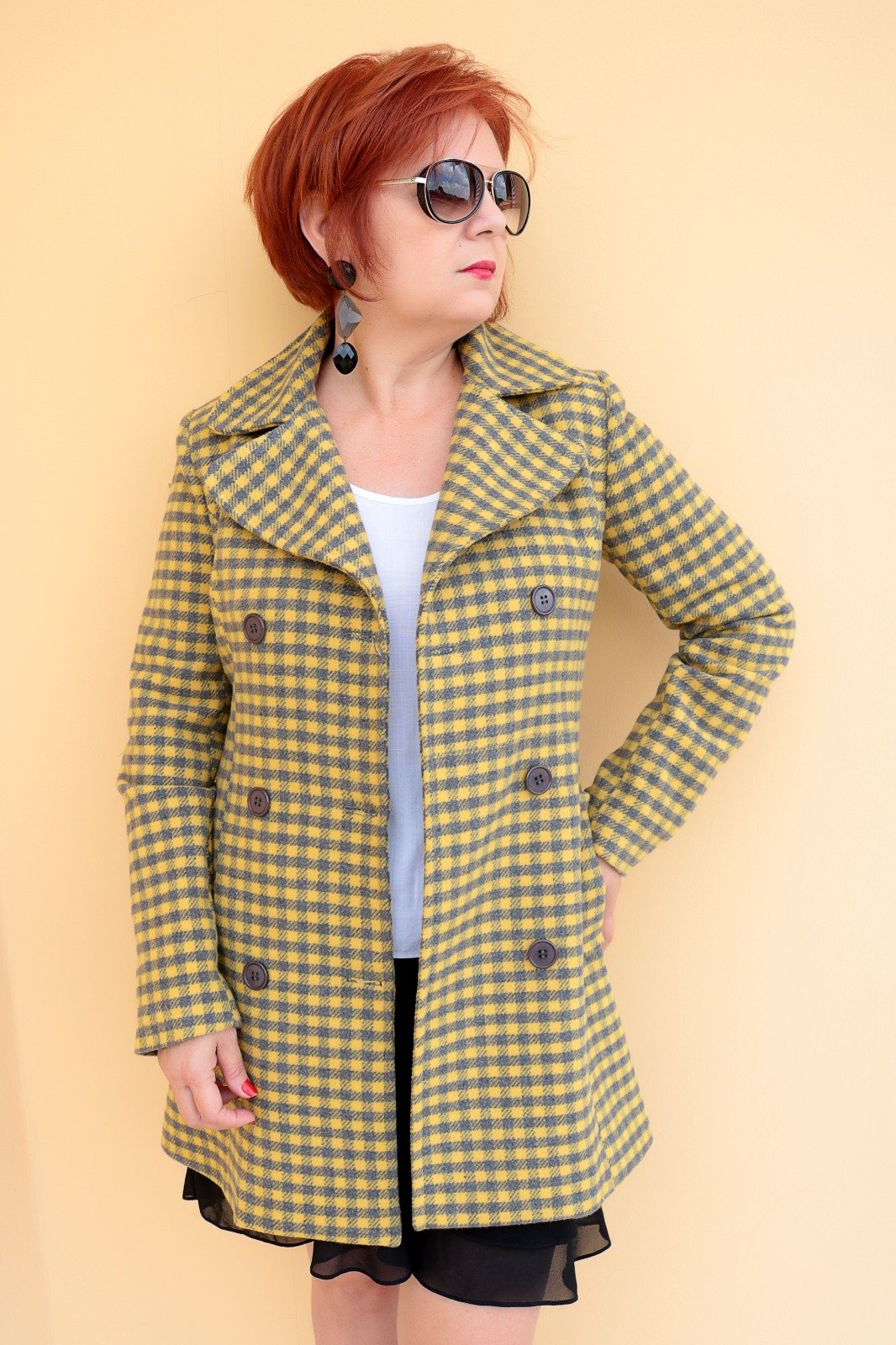 CASACO EM LÃ NA COR AMARELO/CINZA.